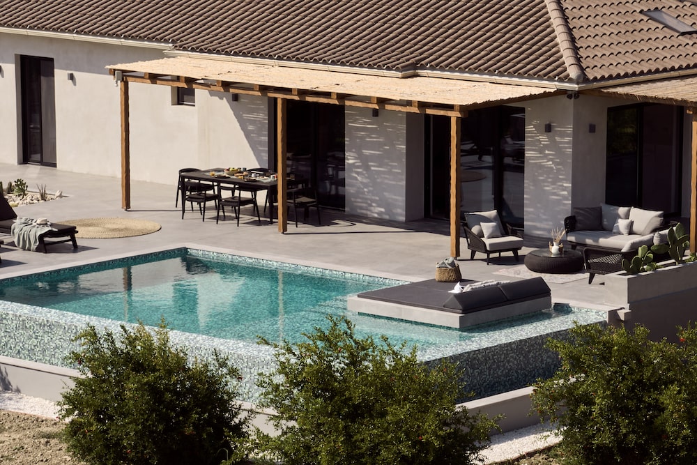 - Verwarmd zwembad (10x5m en 1,50m diep) met jacuzzi-functie en lounge bed in het water. Op het omliggende zonneterras staan ligbedden en er is een buitendouche