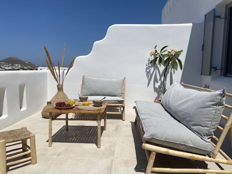 - Balkon gelegen aan de slaapkamer op de eerste verdieping, met bamboe tafel en lounge stoelen.