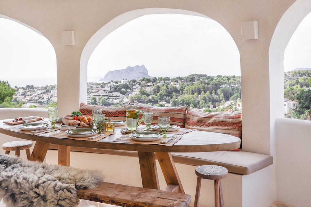 - veranda met grote eettafel en prachtig uitzicht op de omgeving en de zee in de verte. Hier hangt ook een mooie stoel om van dit zich te genieten.