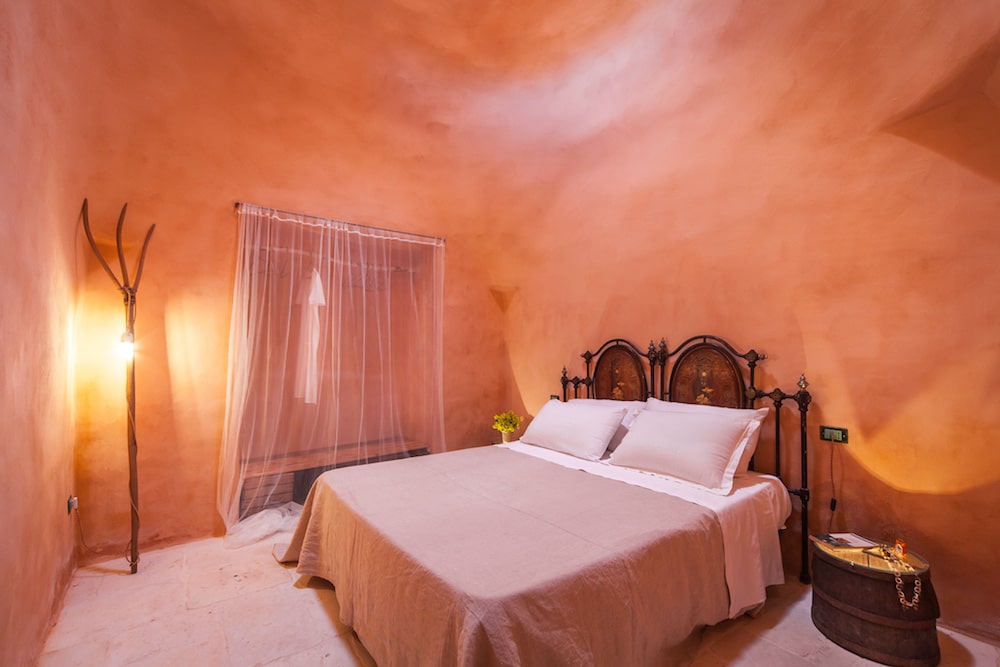 Lamia Grande is a spacious apartment with beautiful vaulted stone ceilings that is fully equipped for 3 people. The entrance of the trulli is in the open living which includes a kitchenette with a gas hob, a dining table for two, and a vintage daybed that serves as a third sleeping place. At the rear, two French doors give direct access to the private terrace. The spacious bedroom has a large double bed and patio doors to a private garden. Two wooden doors open to the beautiful bathroom with a special stone sink, a walk-in shower, and a toilet.