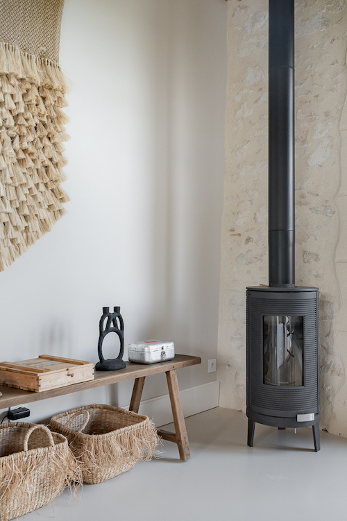 - Loft-style living room with high ceilings and visible wooden beams. In the living room you will find a dining table for 6 people, a comfortable sofa, a wood stove and large French doors to the garden.
