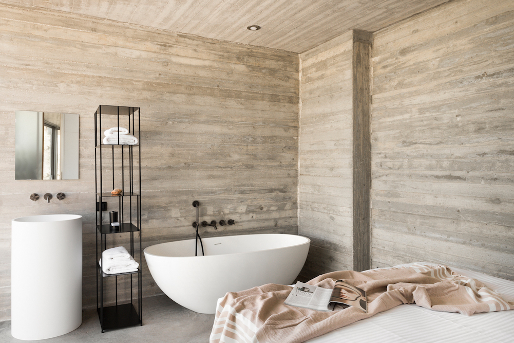 - Slaapkamer met queen size bed en aangrenzend een ligbad en wastafel.